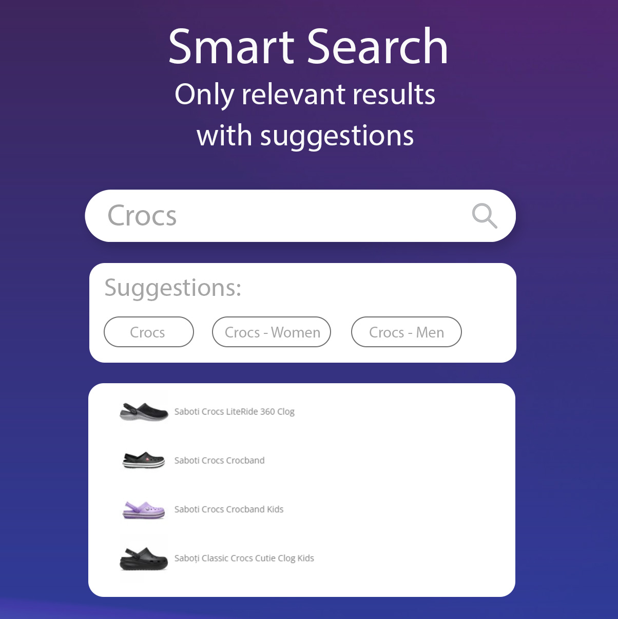 - Rezultate de căutare precise: Algoritmul nostru oferă cele mai relevante rezultate pentru clienții tăi, reducând timpul de căutare și crescând satisfacția acestora.