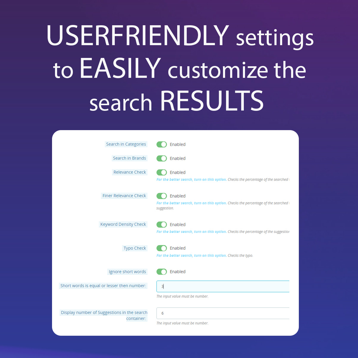 Obține soluția ideală de căutare pentru magazinul tău PrestaShop. Modulul nostru este ușor de utilizat și este conceput cu un algoritm atent optimizat, pentru a oferi clienților tăi cele mai relevante rezultate de căutare.